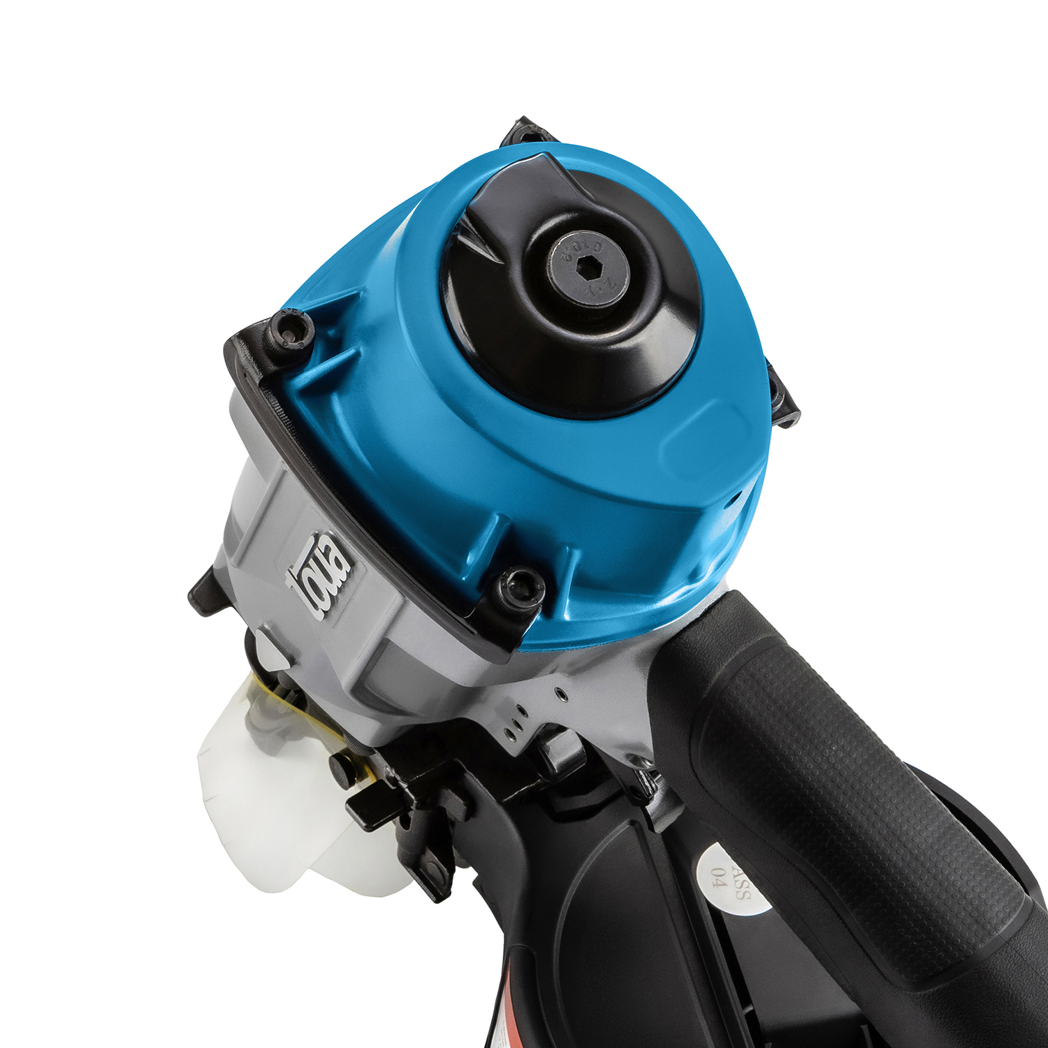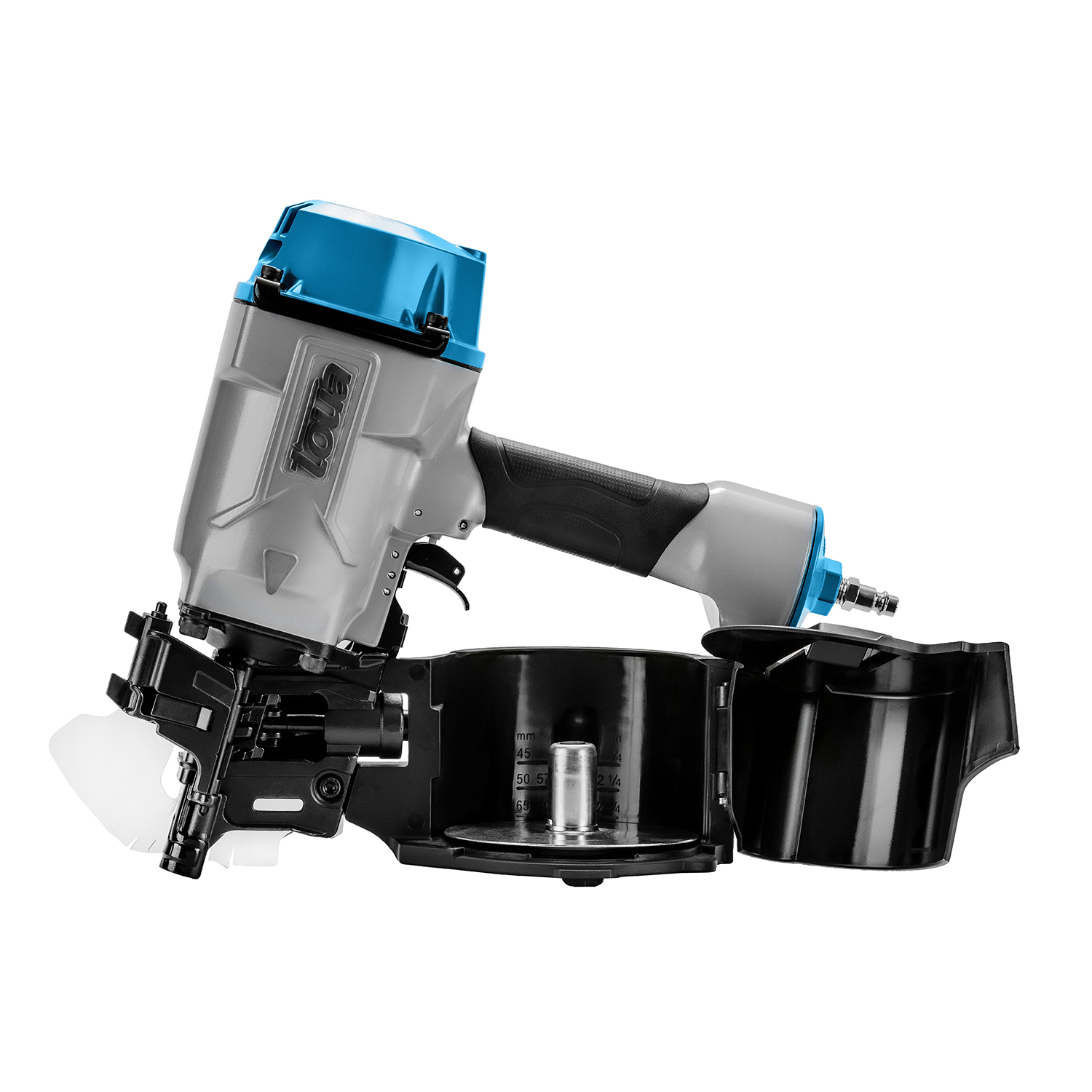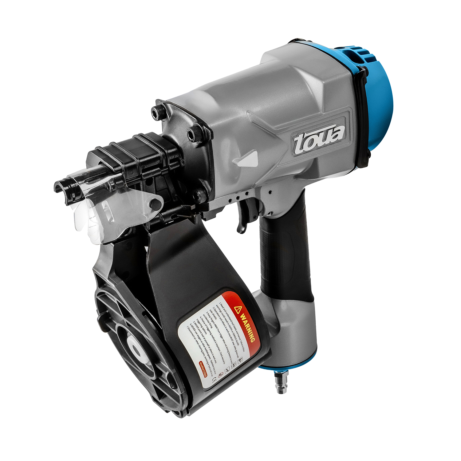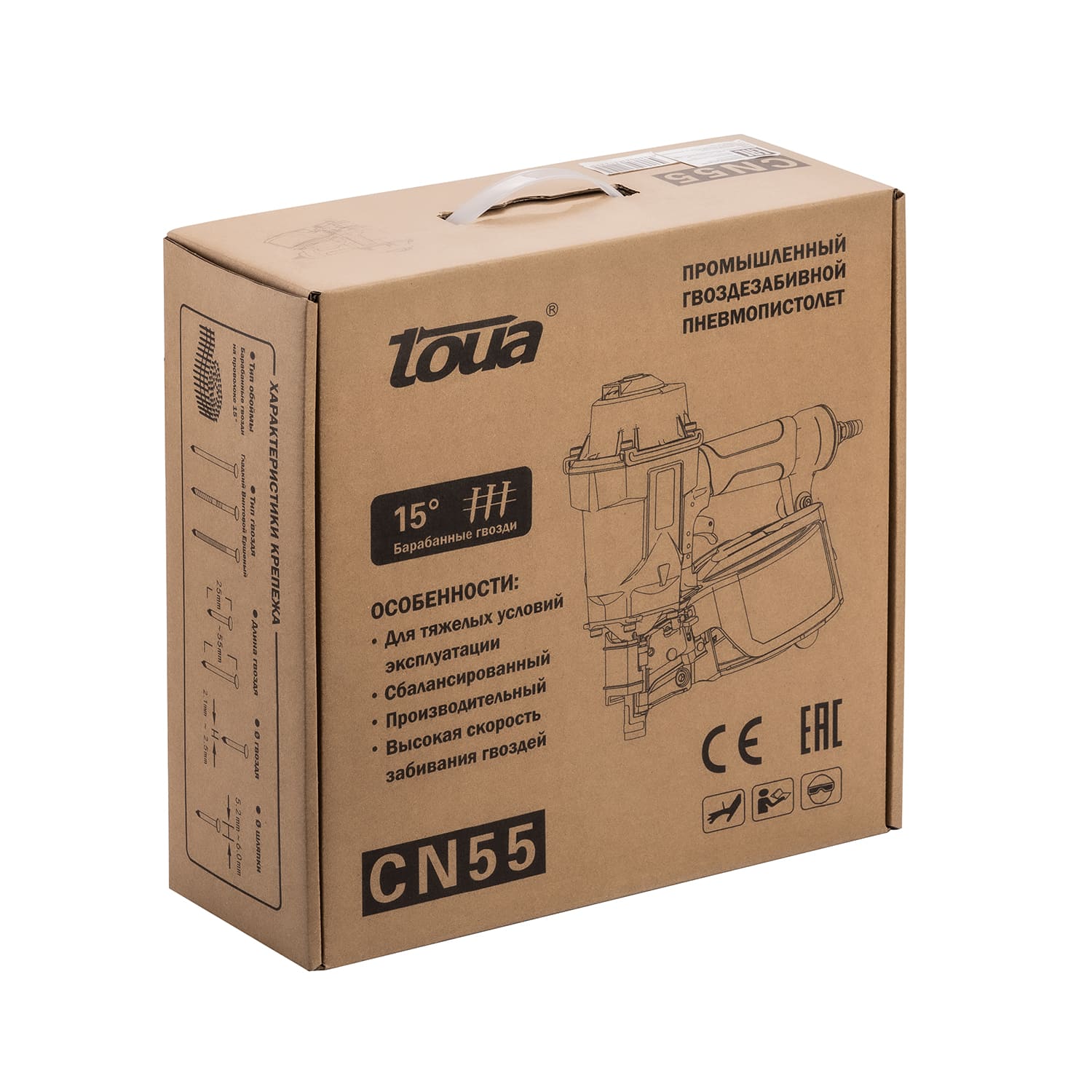 Toua CN55 гвоздезабивной пневматический пистолет барабанного типа работает с гладкими, ершеными и винтовыми гвоздями соединенными между собой проволокой. Обладает высокой производительностью, большим ресурсом и низкой стоимостью точки крепления. Подходит для работ на производстве и конвейерной сборки.