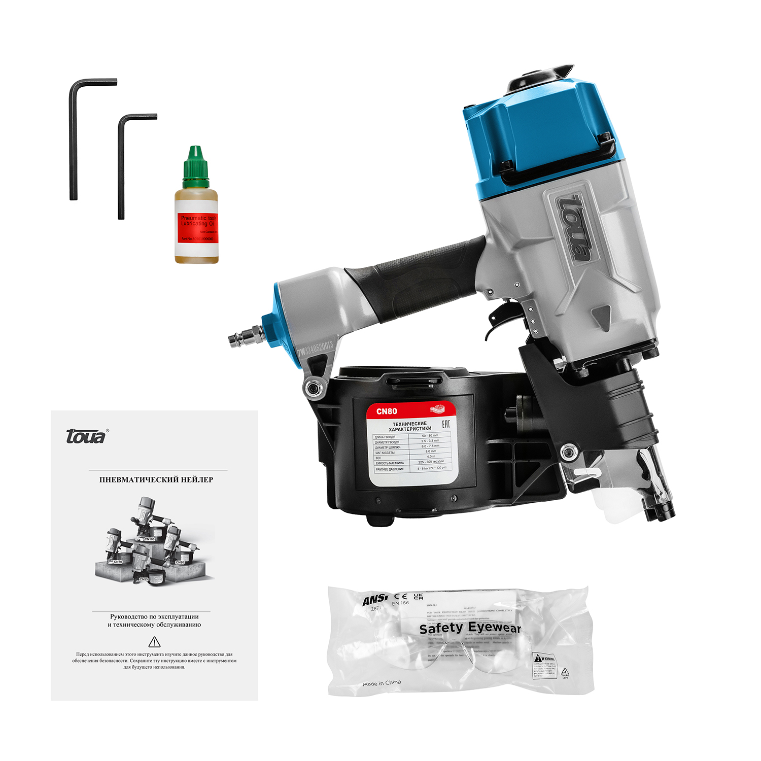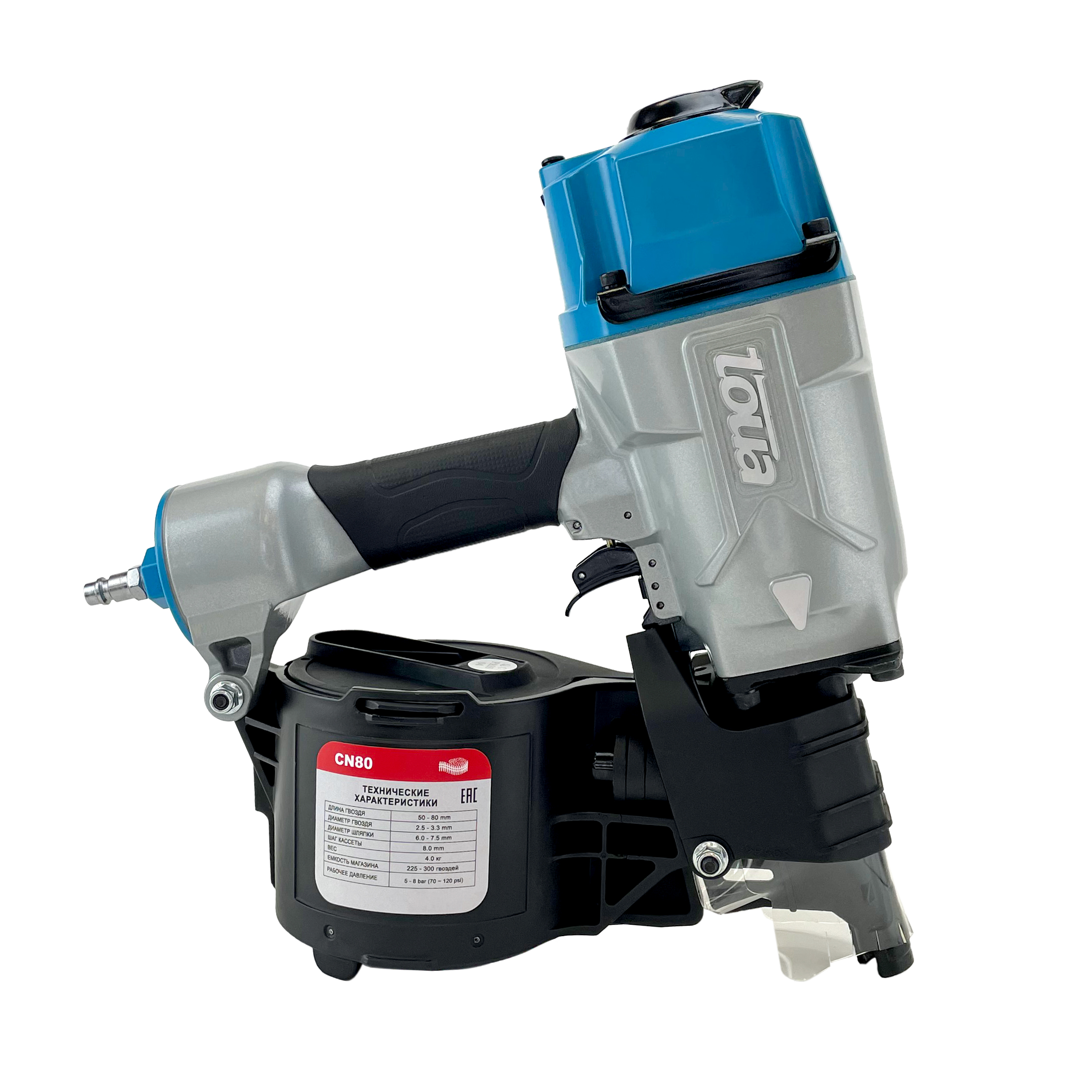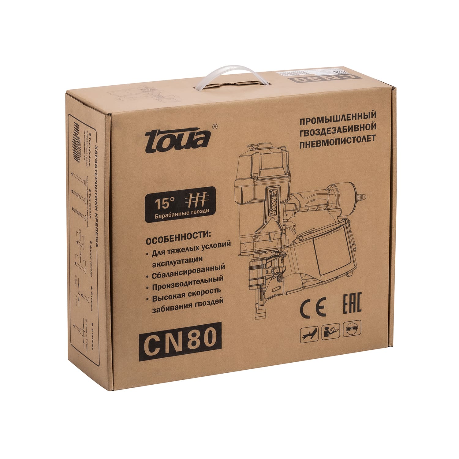 Toua CN80 гвоздезабивной пневматический пистолет барабанного типа работает с гладкими, ершеными и винтовыми гвоздями соединенными между собой проволокой. Обладает высокой производительностью, большим ресурсом и низкой стоимостью точки крепления. Подходит для работ на производстве и конвейерной сборки.