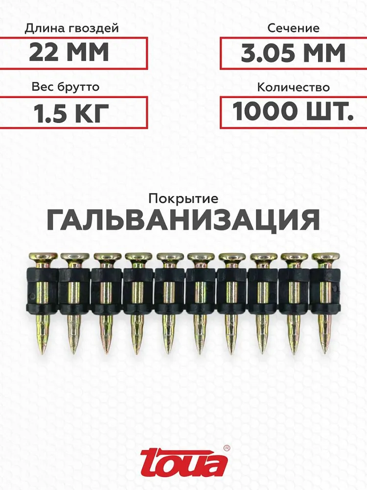 Гвозди по бетону, металлу, кирпичу Toua CN подходят для большинства газовых, аккумуляторных и пневматических монтажных пистолетов, широко используются в общестроительном монтаже.